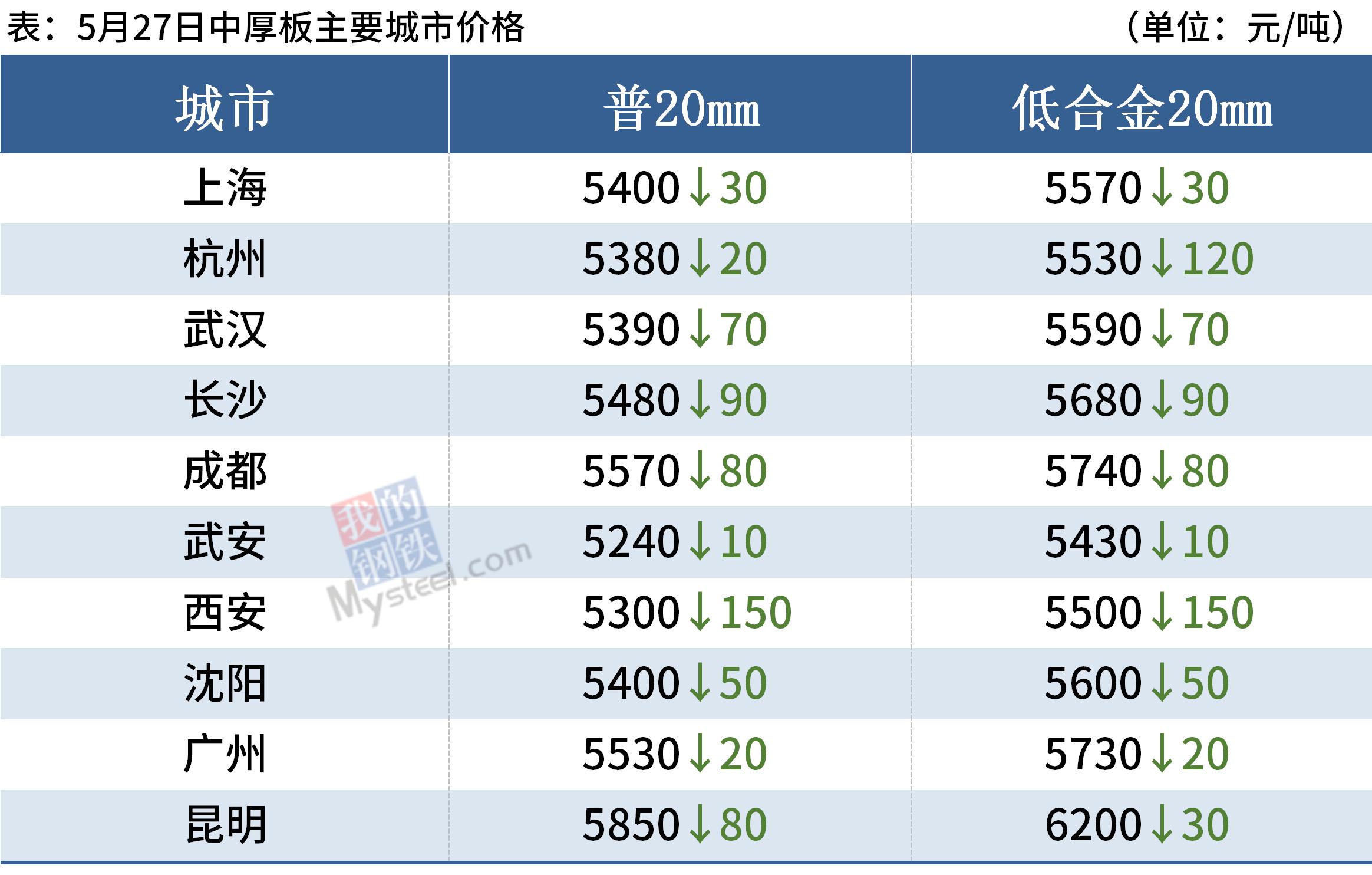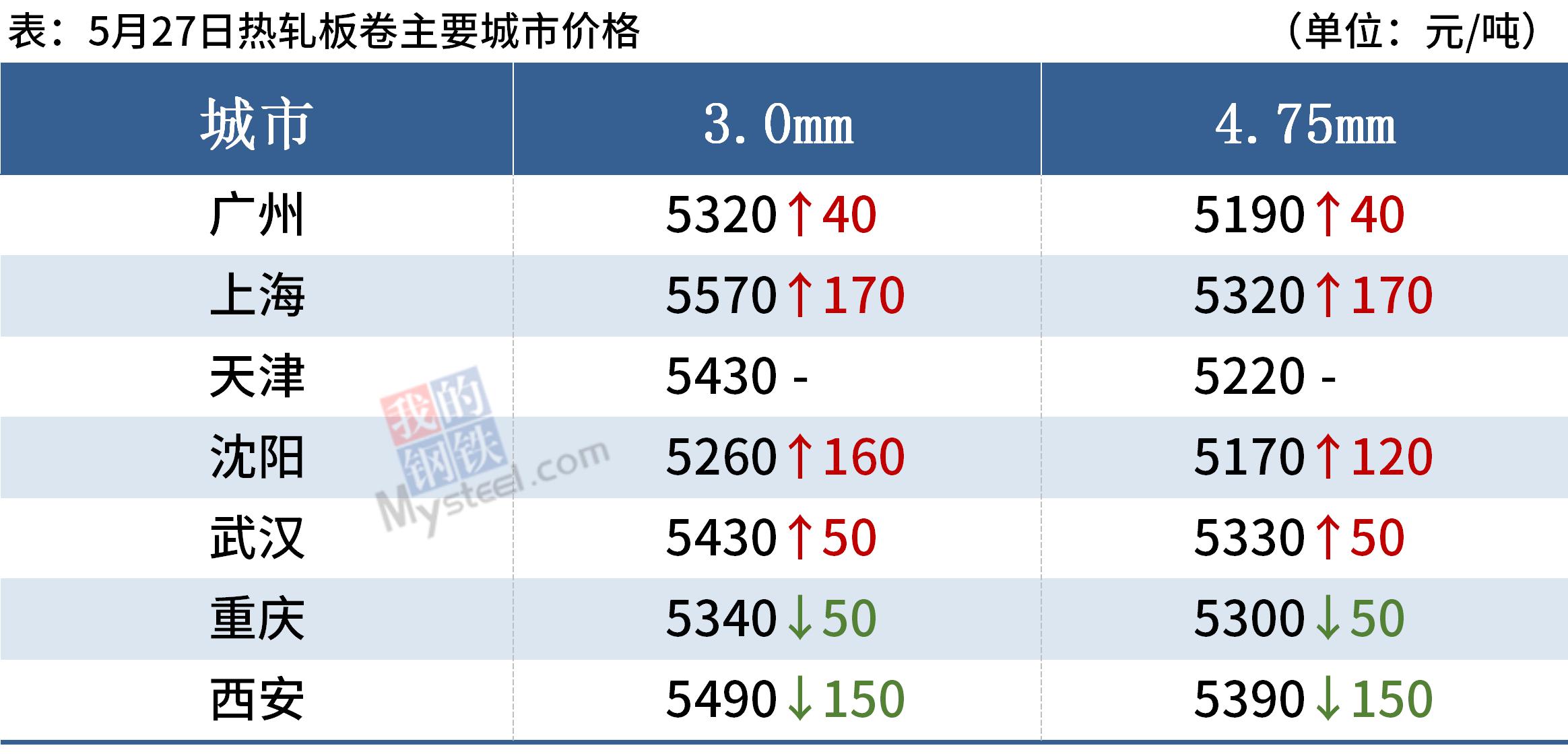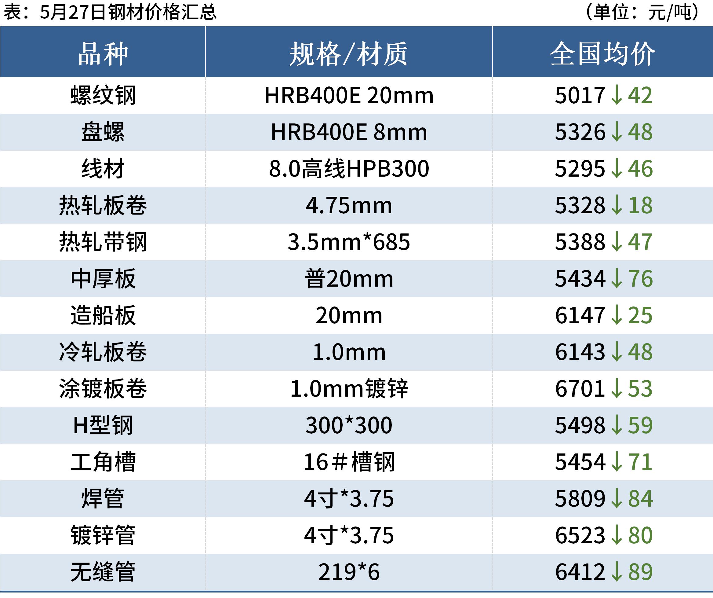 熱軋板卷:5月27日,全國24個主要城市4.75mm熱軋板卷均價5328元/噸,較上個交易日下跌18元/噸。經過26日的大幅下跌,市場情緒釋放,多數商家愿意挺價不跌,目前現貨商家手中資源基本已經打穿成本線,加上基本面尚可,商家基本不愿低價出售,挺價意愿較強,不求大幅反彈但也想穩住價格頹勢,綜合來看,短期盤面和現貨均觸底回升有企穩跡象。