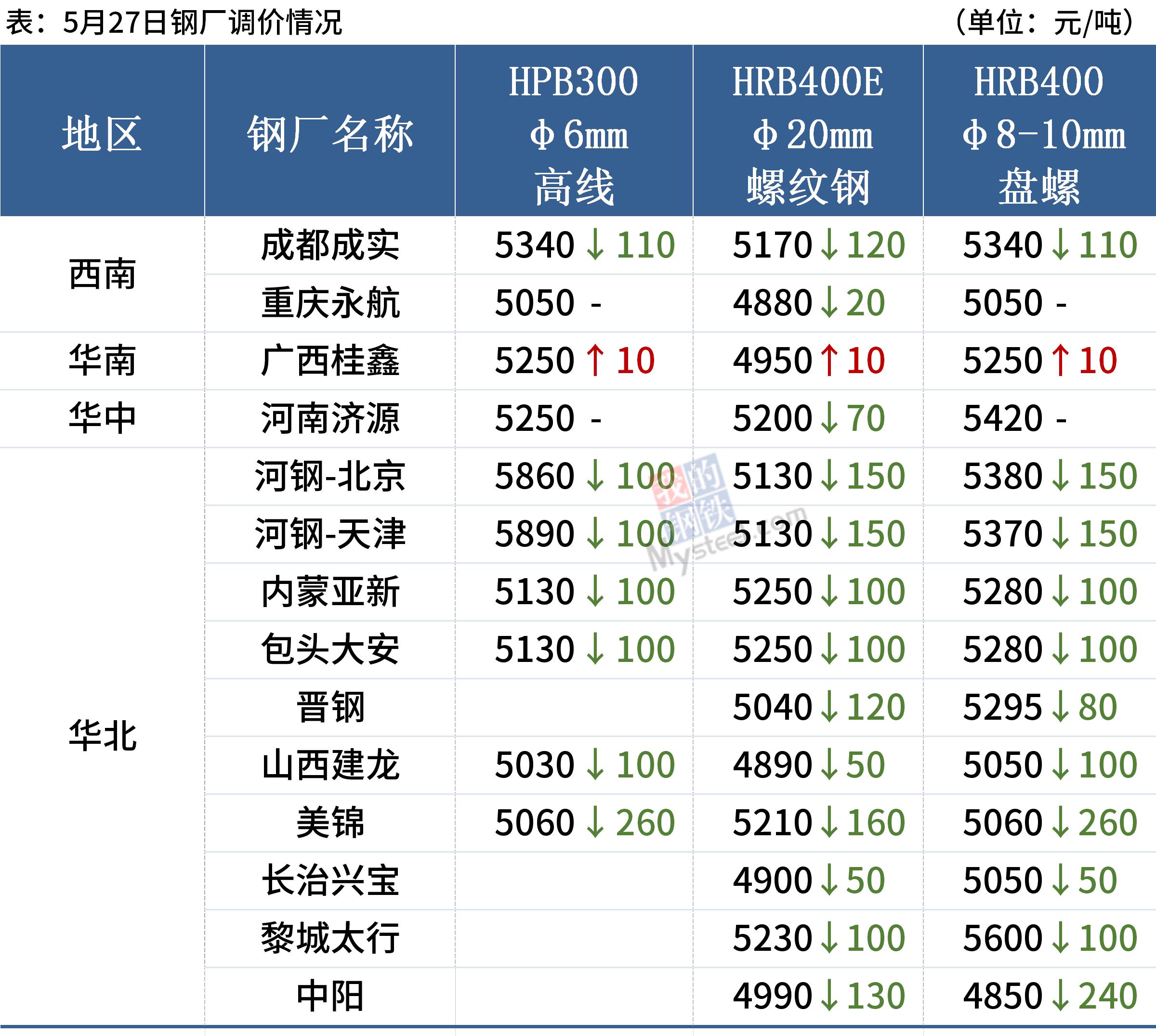 27日,國內12家鋼廠下調建筑鋼材出廠價20-260元/噸。