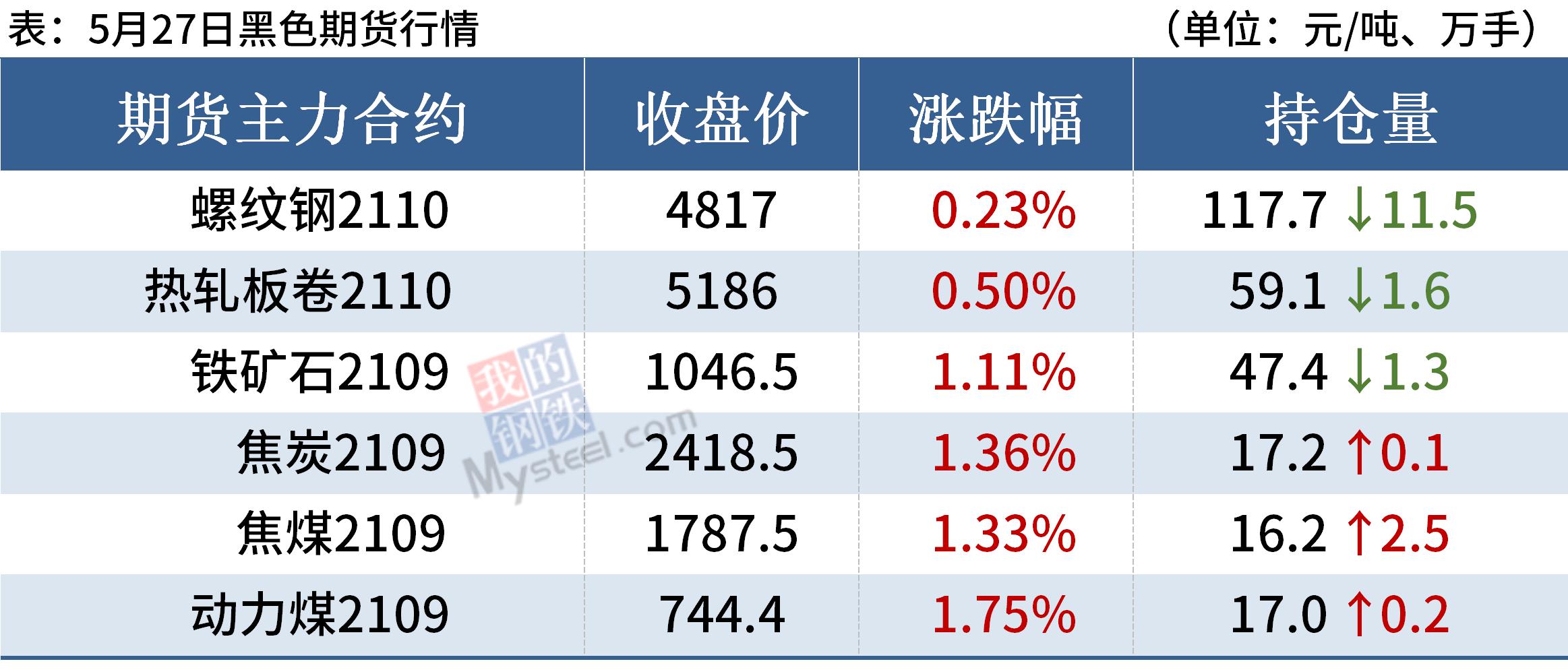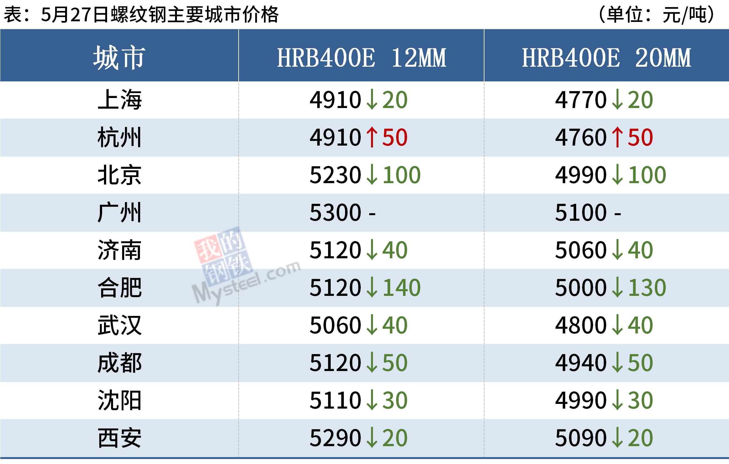 建筑鋼材:5月27日,全國31個主要城市20mm三級抗震螺紋鋼均價5017元/噸,較上個交易日下跌42元/噸。從成交來看,市場投機性需求稍有好轉,次終端及下游采購意愿亦有所增強,整體成交放量。消息面上, Mysteel數據顯示本周建筑鋼材產量小幅下降,社會庫存降幅收窄,鋼廠庫存繼續增加,庫存總量去化有所放緩,建筑鋼材表觀消費量較上周亦有所下降。目前來看,市場心態仍較為謹慎,商家以積極出貨為主。
