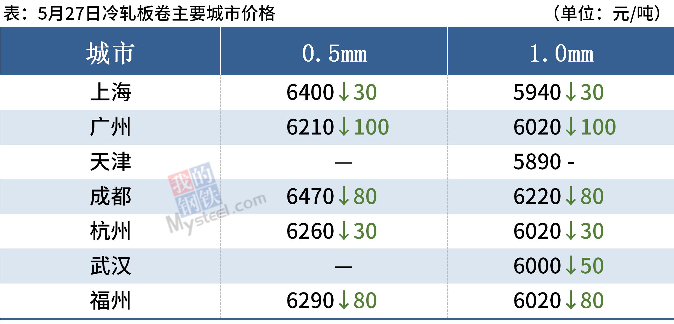 冷軋板卷:5月27日,全國24個主要城市1.0mm冷卷均價6143元/噸,較上個交易日下跌48元/噸。受今日黑色期貨超低反彈,午后部分品種窄幅回暖,冷軋仍無回暖跡象。冷軋基本面基本面看,今日統計廠庫社庫分別增加0.64萬噸和0.93萬噸,且受成本高部分區域鋼廠接單不理想,預計后期廠庫增量或有所放大。