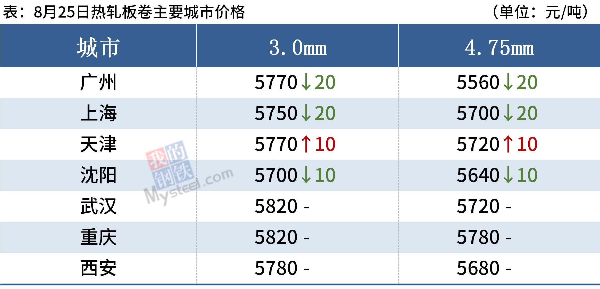 熱軋板卷:8月25日,全國24個主要城市4.75mm熱軋板卷均價5740元/噸,較上個交易日上漲3元/噸。目前市場需求經(jīng)過周初兩天好轉后,再度轉弱,下游采購持續(xù)性偏差,觀望情緒較濃,基本還是按需采購為主,投機需求補貨暫緩,市場成交整體表現(xiàn)偏弱。不過考慮到商家資源成本較高及即將進入九月份需求的回暖,商家對后市較為謹慎看好,挺價意愿較強。綜合來看,預計26日熱軋板卷價格或將弱勢震蕩為主。
