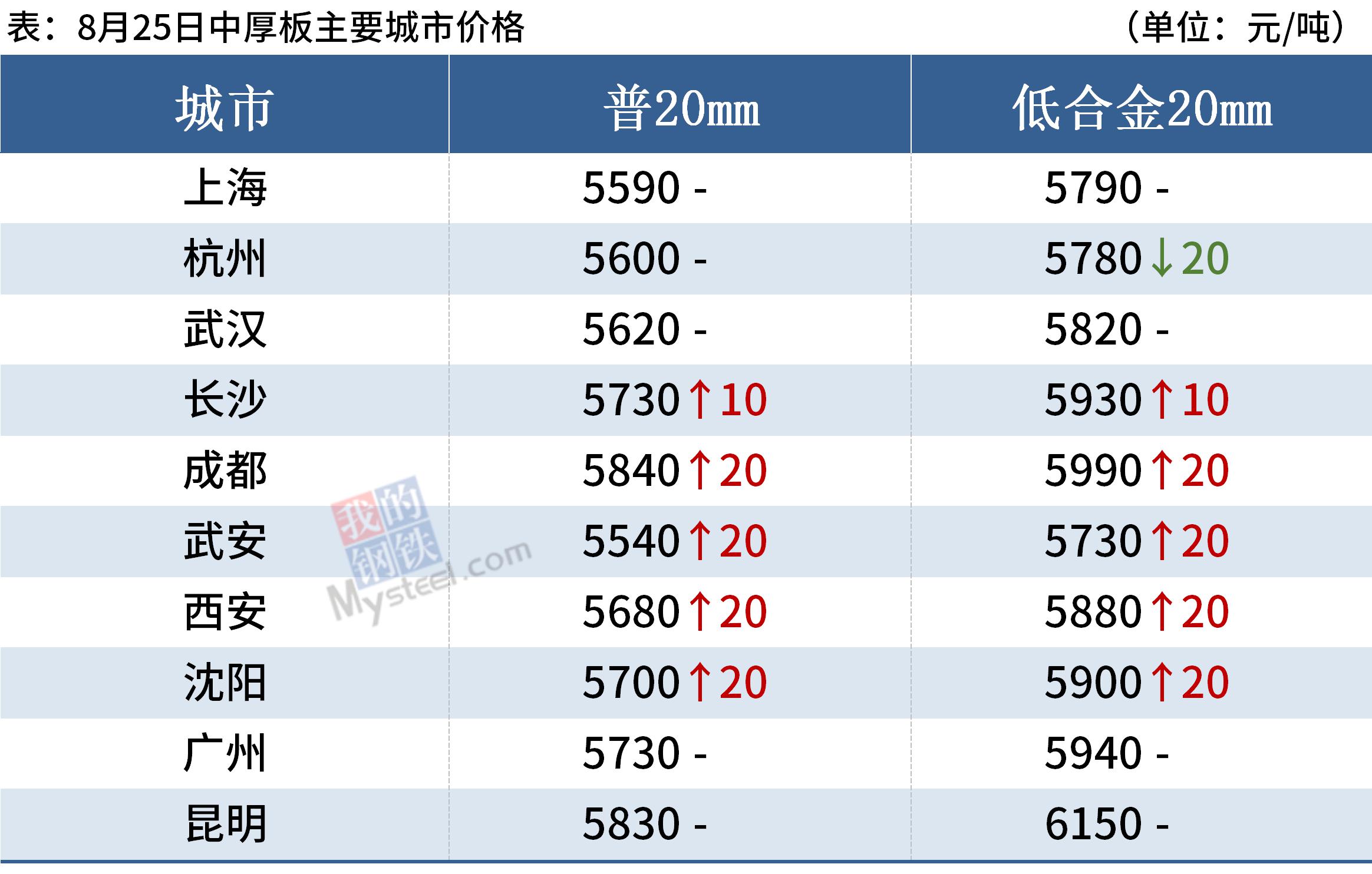 中厚板:8月25日,全國24個主要城市20mm普板均價5681元/噸,較上個交易日價格上漲5元/噸。今日市場整體采購放緩,商家也趨于謹慎,全天多數(shù)區(qū)域報價持穩(wěn)為主,且成交表現(xiàn)一般。資源方面,目前由于華南區(qū)域部分鋼廠中厚板減量,且北材不具南下優(yōu)勢,市場現(xiàn)貨庫存持續(xù)下降,其中低合金資源已逐步緊缺。綜合來看,目前需求釋放不足,預計26日中厚板價格延續(xù)震蕩盤整為主。