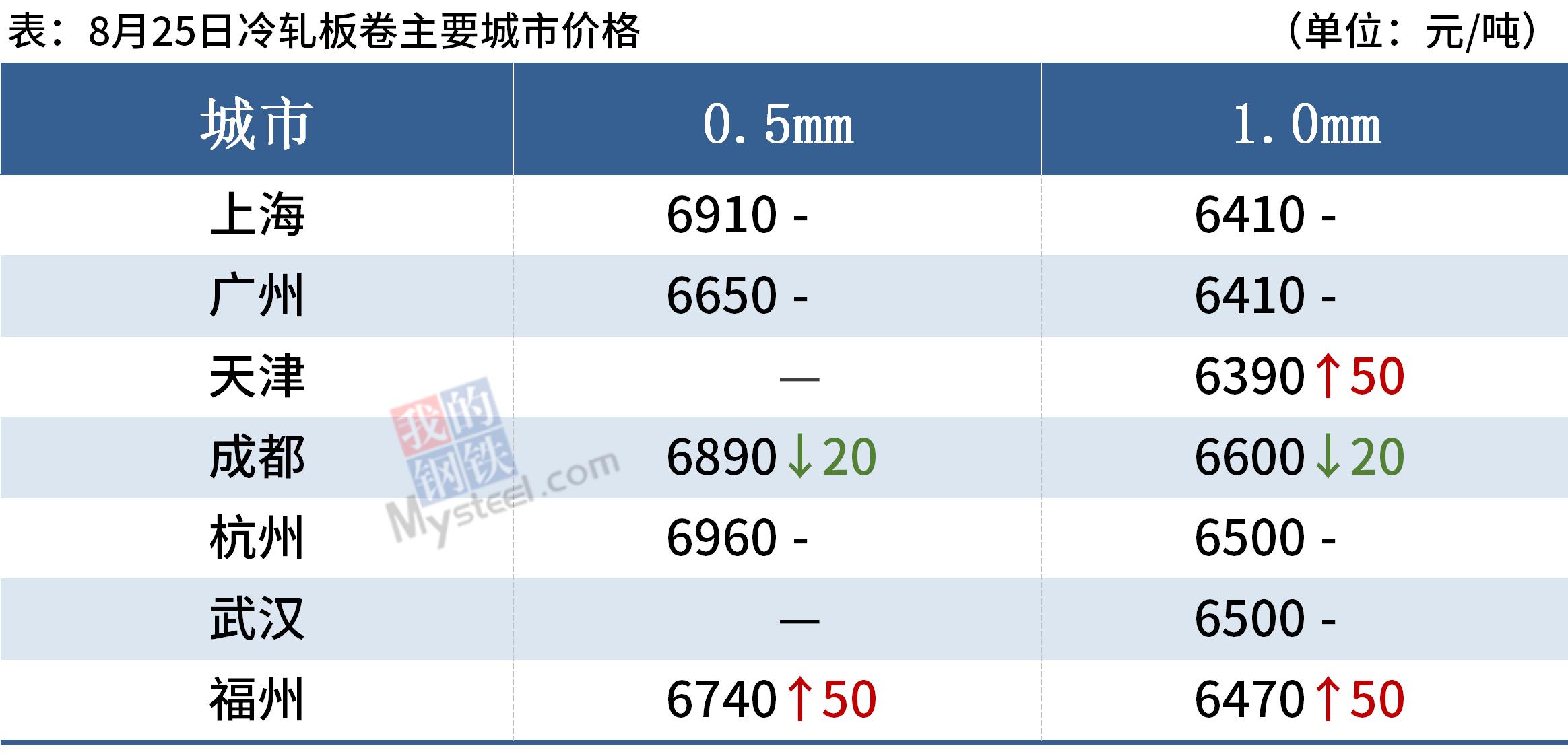 冷軋板卷:8月25日,全國24個主要城市1.0mm冷卷均價6507元/噸,較上個交易日上漲4元/噸。鞍本鋼計劃9月對冷軋軋機進行檢修,后期資源供應將有所減少,商家挺價情緒較濃。然市場終端依舊觀望,高位成交略顯疲軟,商家整體出貨表現(xiàn)偏弱。綜合來看,26日國內(nèi)冷軋價格震蕩運行為主。