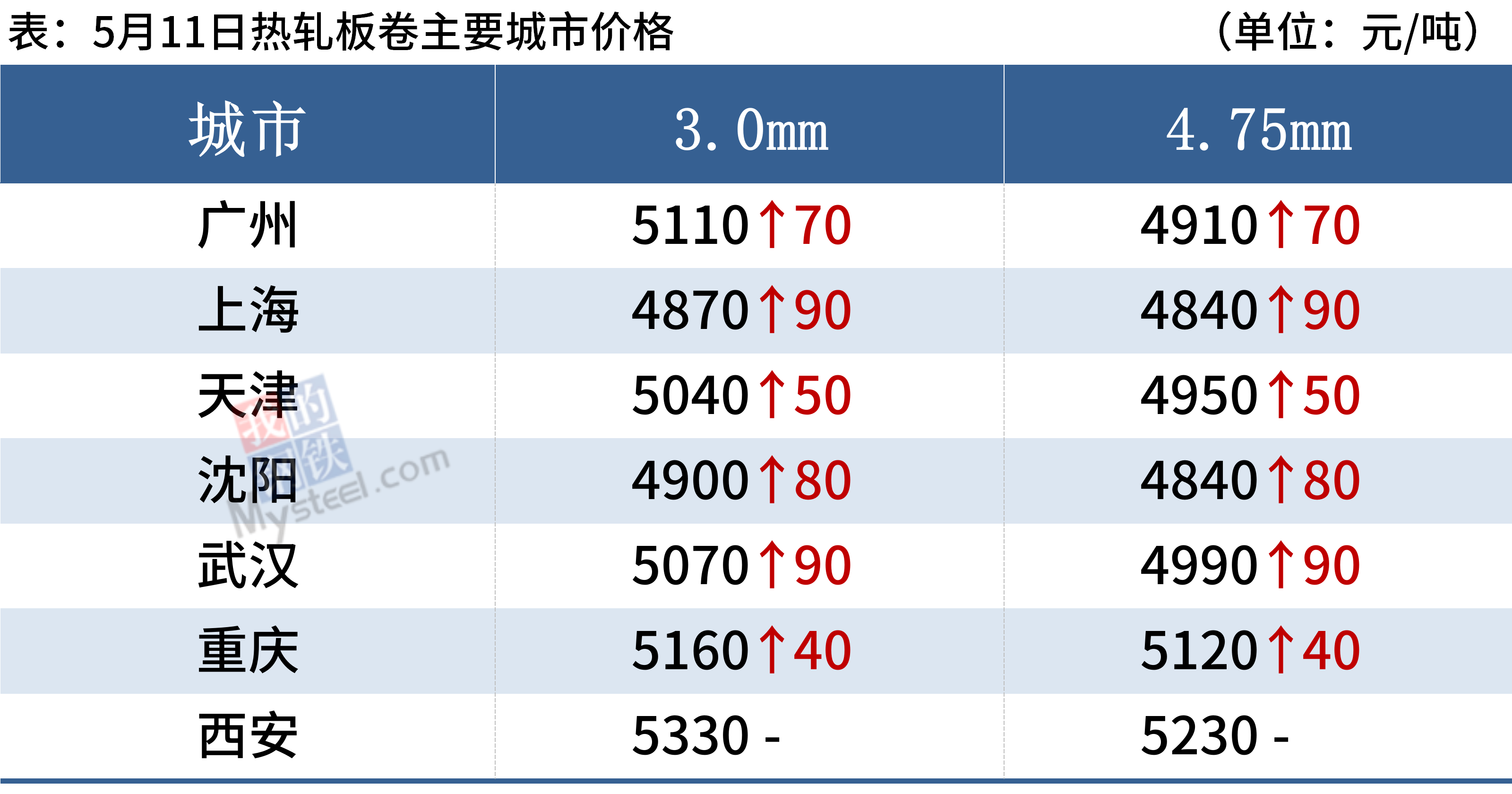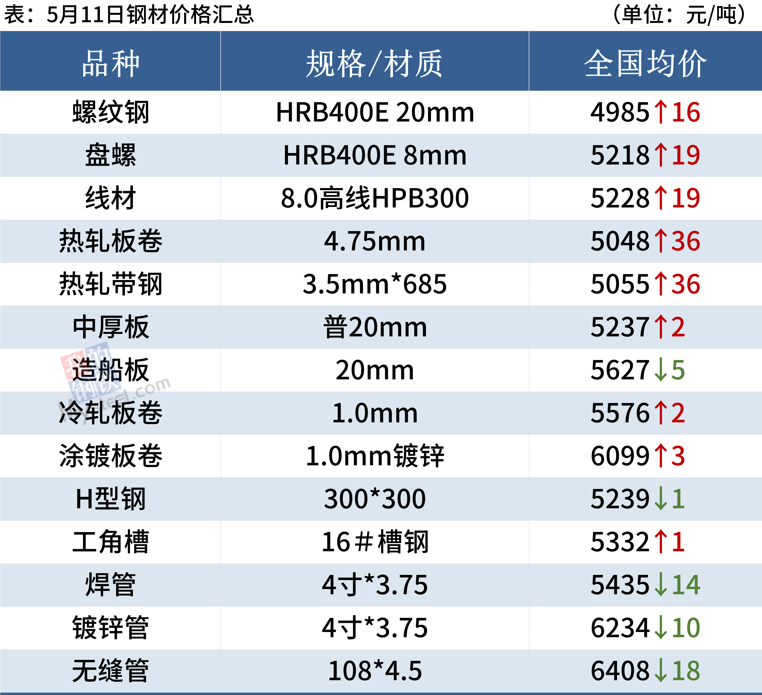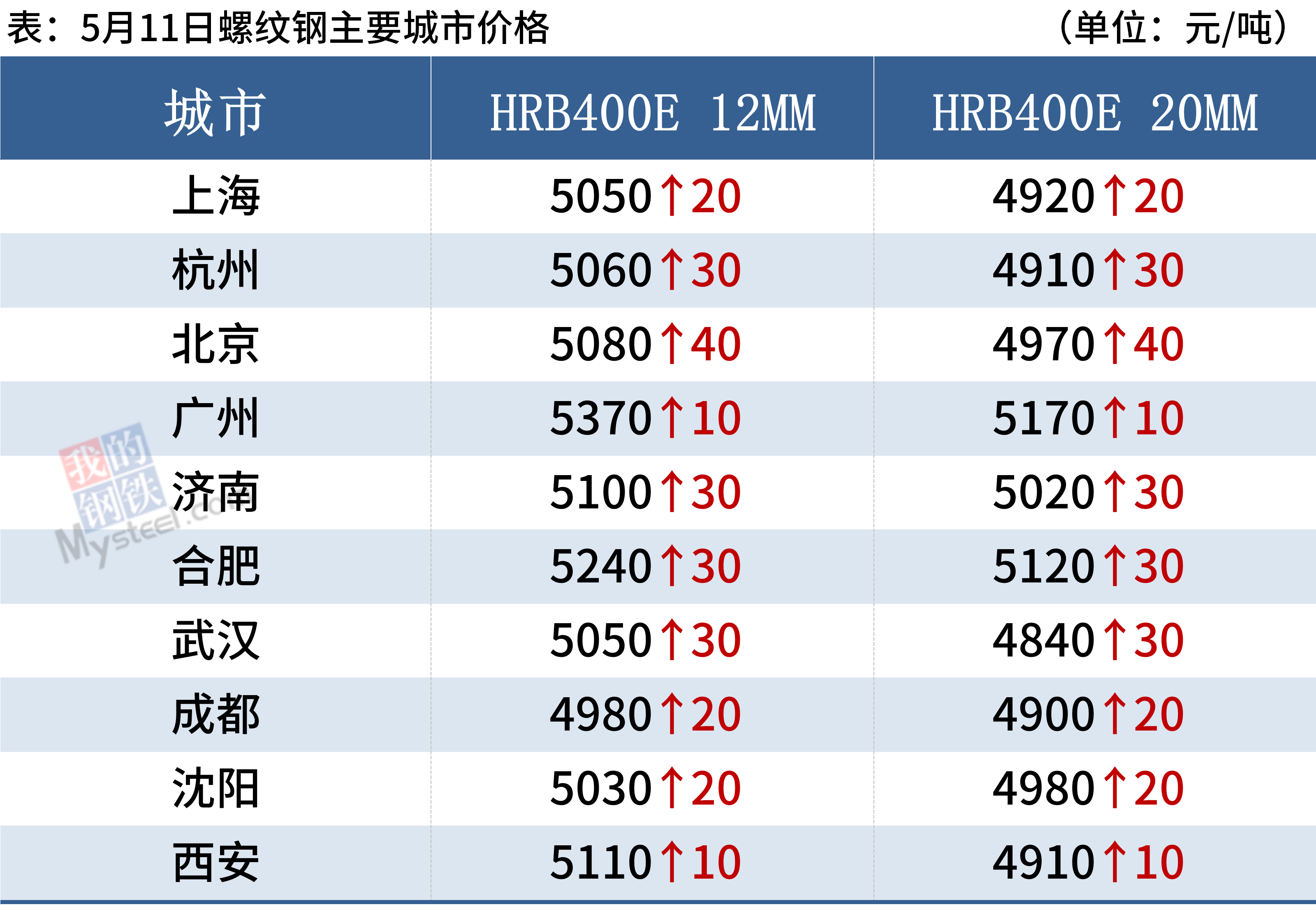 5月11日,國內(nèi)鋼材市場上漲為主,唐山鋼坯出廠價格漲20報4640元/噸。成交方面,市場心態(tài)修復(fù),投機需求有所增加,低價資源消失。