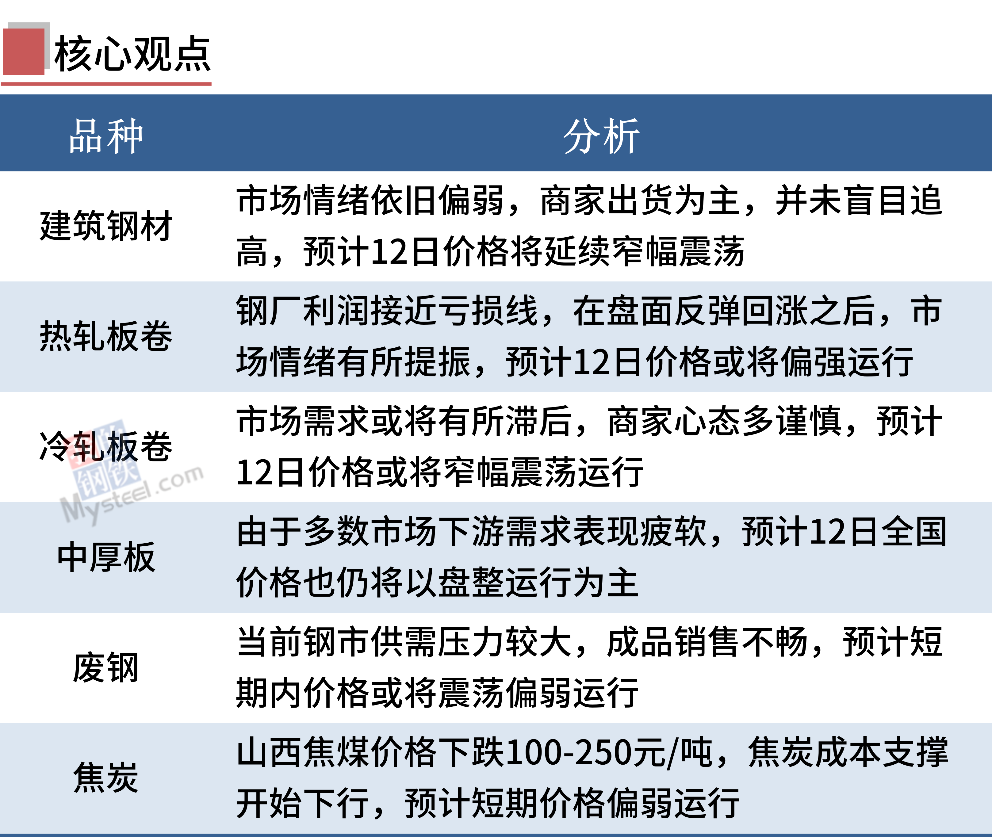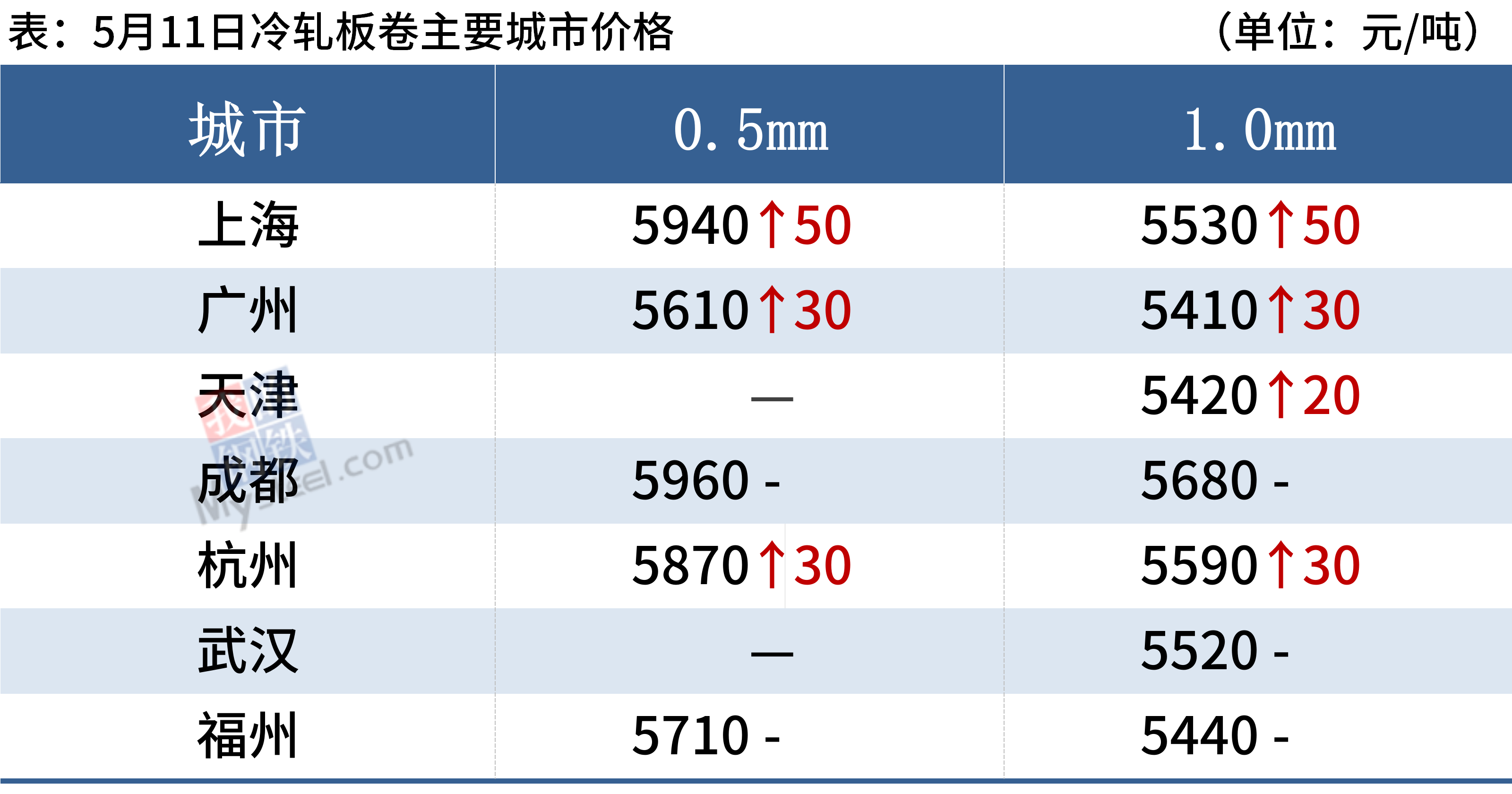 冷軋板卷:5月11日,全國24個主要城市1.0mm冷卷均價5576元/噸,較上個交易日持上漲2元/噸。市場方面,隨著熱卷期貨止跌反彈,市場交投氛圍有所好轉(zhuǎn),市場成交明顯增量。商家表示,前期市場價格持續(xù)下行,下游多持觀望態(tài)度,隨著價格逐步企穩(wěn),前期被抑制的需求有所放量。心態(tài)方面,全國疫情散點式爆發(fā),加之南方近期進(jìn)入汛期,市場需求或?qū)⒂兴鶞螅碳倚膽B(tài)多謹(jǐn)慎,當(dāng)下操作以出貨成交為主。綜上所述,預(yù)計12日全國冷軋板卷價格或?qū)⒄鹗庍\行。