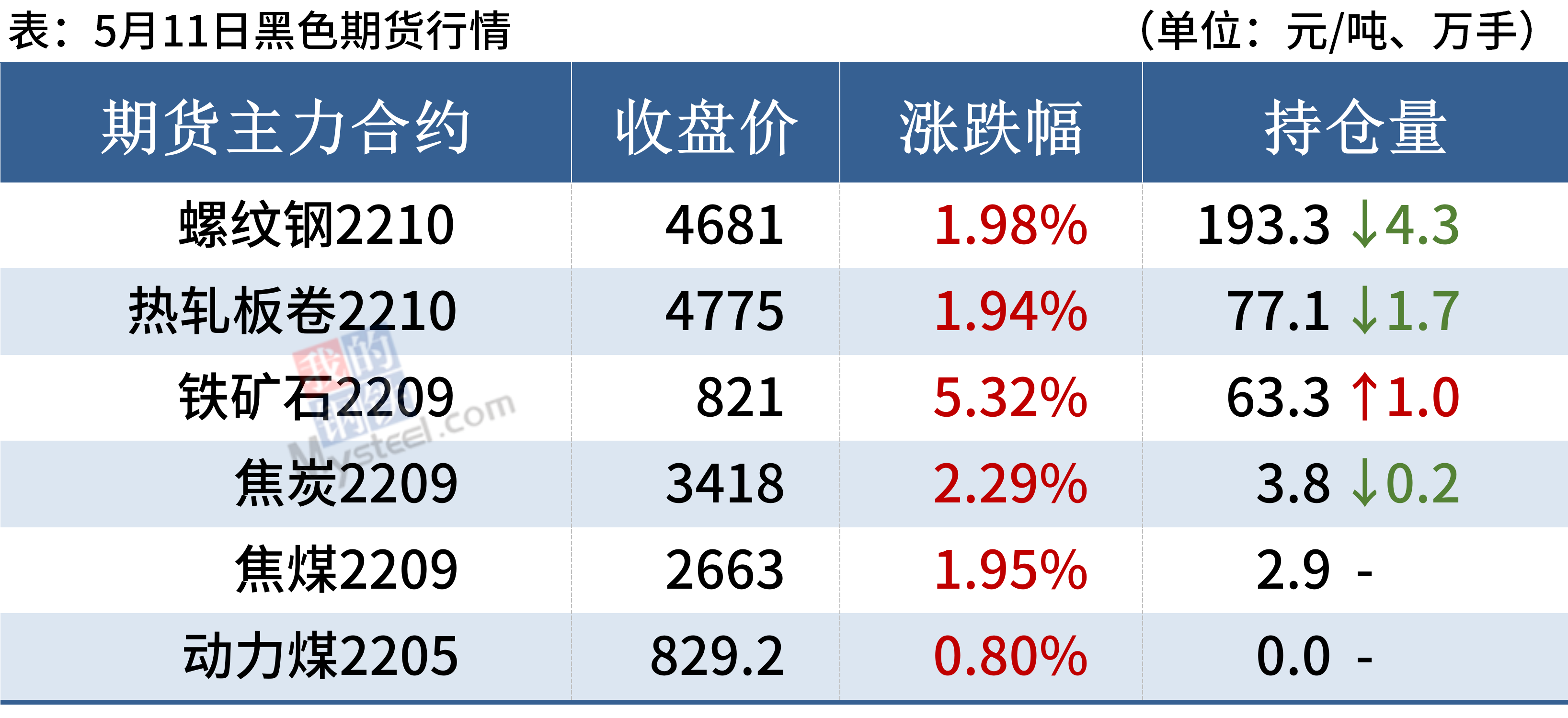 焦炭:5月11日,焦炭市場偏弱運行,焦炭市場全面落實第二輪降價,累計降幅為400元/噸。焦企前期焦化利潤修復(fù),產(chǎn)地開工多提升至高位,焦炭供應(yīng)相對有保證,即產(chǎn)即銷,多以積極出貨為主。鋼廠方面,鋼廠開工仍在高位,剛需仍在,鋼廠多有意控制到貨節(jié)奏。焦煤方面,前期降價后出貨仍不佳,部分煤礦庫存累積,今日山西焦煤價格下跌100-250元/噸,焦炭成本支撐開始下行,預(yù)計短期內(nèi)焦炭市場偏弱運行。