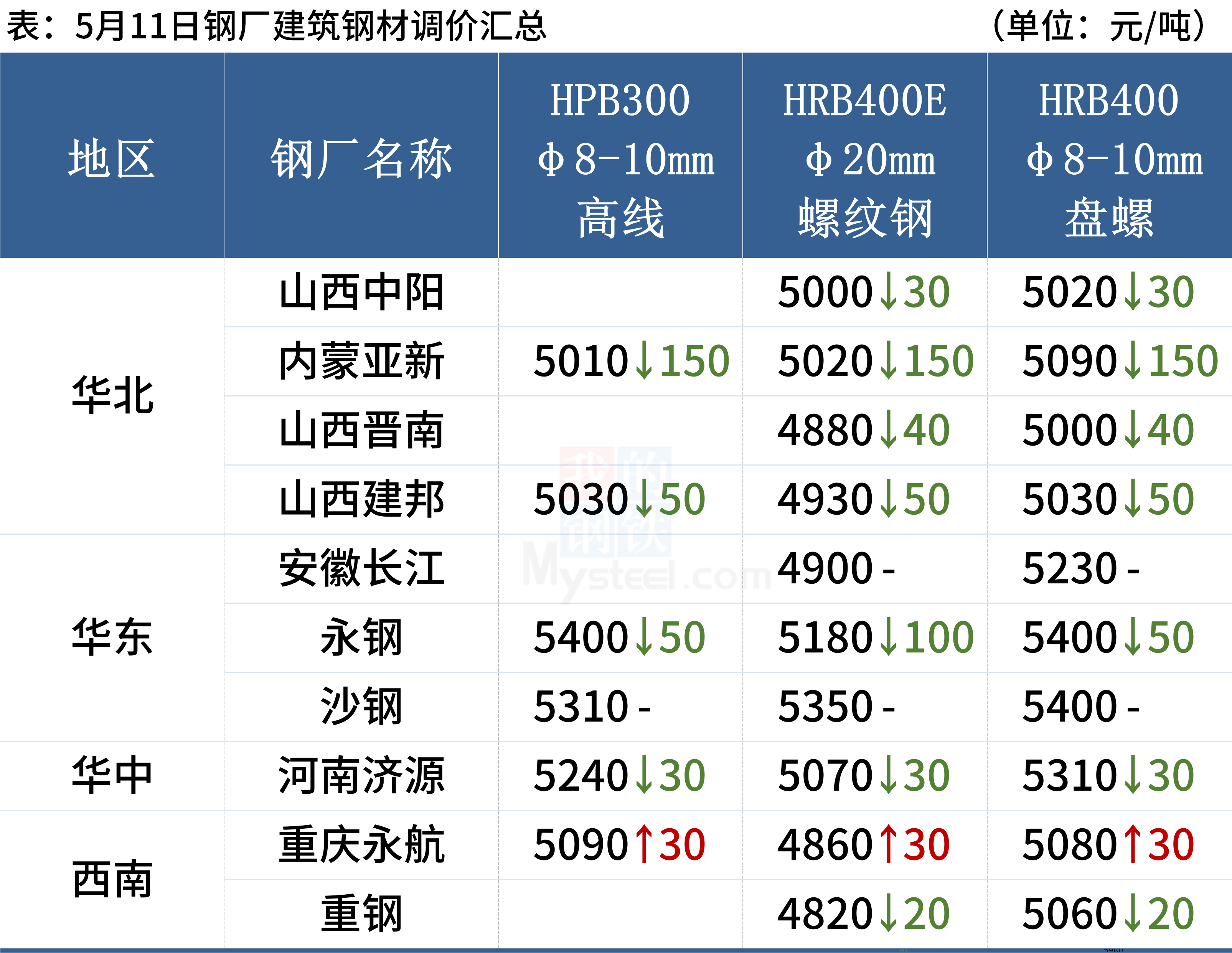 11日,7家鋼廠下調(diào)建筑鋼材出廠價20-150元/噸。