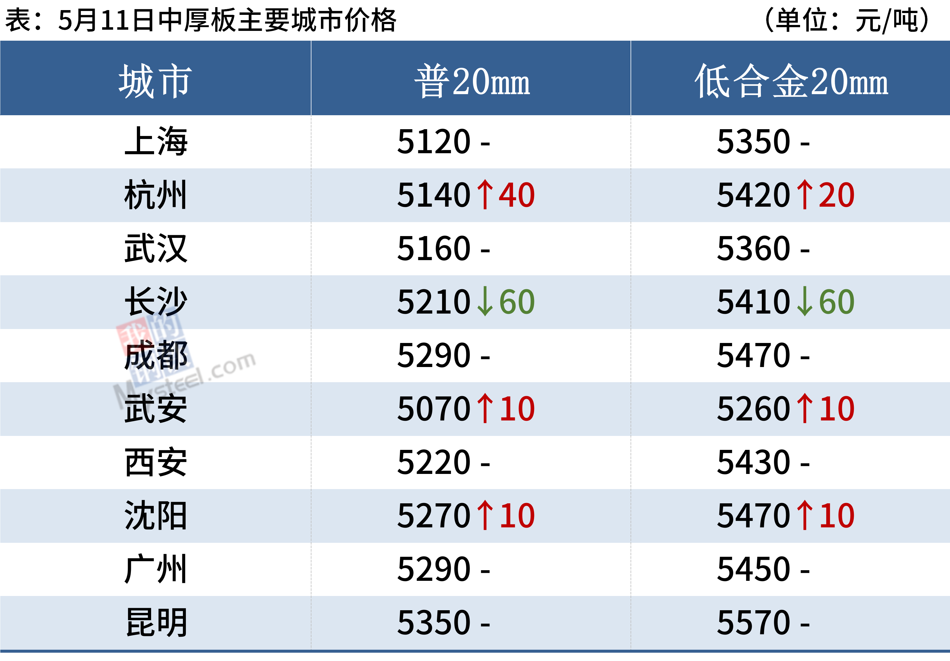 中厚板5月11日,全國24個主要城市20mm普板均價5237元/噸,較上一交易日上漲2元/噸。盤面上行,個別市場跟隨小幅走高,不過多數(shù)區(qū)域受限于下游需求表現(xiàn)疲軟,市場實際成交表現(xiàn)不佳,整日主流市場報價盤整運行為主。資源方面,雖目前南北價差有所修復(fù),但考慮到目前下游需求釋放力度不足,加上商家觀望情緒濃厚,短期內(nèi)貿(mào)易商主動備貨意愿不強。綜合來看,由于多數(shù)市場下游需求表現(xiàn)疲軟,加上部分區(qū)域受疫情的影響,預(yù)計12日全國中厚板價格也仍將以盤整運行為主。