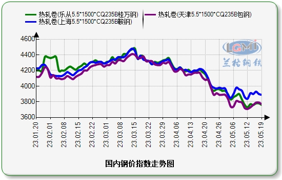 近期熱卷市場進入區(qū)間震蕩格局,市場業(yè)者謹慎購銷為主,整體交投氣氛偏弱。據蘭格鋼鐵網統(tǒng)計數據顯示,截止到5月19日,國內熱卷均價為3830元,較5月12日當周上漲33元。重點城市方面,截止到5月19日,天津市場包鋼價格為3770元,較5月12日上漲60元;上海市場鞍鋼均價3890元,上漲50元;樂從市場桂萬鋼均價3760元,上漲30元。整體來看,華東區(qū)域成交價格受熱卷供應偏低以及庫存低位支撐,成交價格相對高位;而華南市場受社會庫存高位拖累,市場成交價格稍弱與華北區(qū)域。