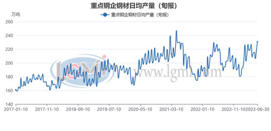 據中國鋼鐵工業協會統計數據顯示,2023年6月下旬重點鋼企生鐵日均產量202.87萬噸,旬環比上升0.52%,同比上升4.59%;6月下旬重點鋼企粗鋼日均產量224.6萬噸,旬環比下降0.74%,同比上升7.0%;6月下旬重點鋼企鋼材日均產量230.65萬噸,旬環比上升6.41%,同比上升6.9%。