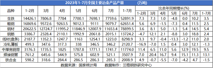 從各品種細分產量來看,7月份,建筑鋼材類、板材類和管材類全品種產量呈現環比下降態勢,但同比呈現大幅上升態勢(詳見表1),這表明下游需求明顯不振,釋放力度不及預期。