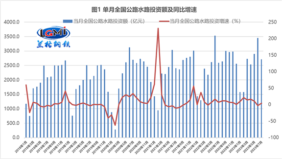 就單月投資額來看,據(jù)蘭格鋼鐵研究中心測算,7月份公路水路交通固定資產(chǎn)投資2716億元,同比增長4.8%,環(huán)比由負(fù)增長轉(zhuǎn)為正增長(詳見圖1);其中公路建投資2548億元,同比增長3.9%;水路建設(shè)投資168億元,同比增長20.8%。雖然7月公路水路交通固定資產(chǎn)同比實(shí)現(xiàn)了正增長,但環(huán)比卻大幅下降21.3%,這表明了公路及水路交通投資領(lǐng)域后勁不足。