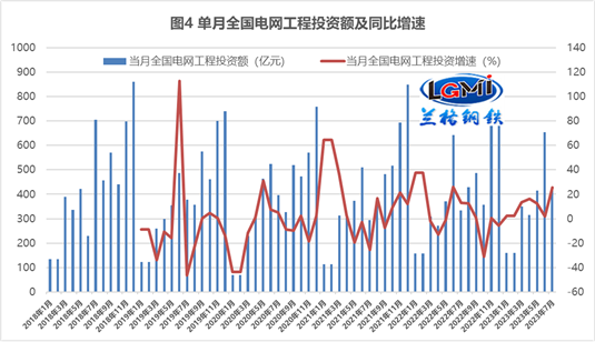 就單月投資額來看,據(jù)蘭格鋼鐵研究中心測算,7月份全國主要發(fā)電企業(yè)電源工程完成投資694億元,同比增長57.0%,增速環(huán)比加快21.8個(gè)百分點(diǎn);全國電網(wǎng)工程完成投資419億元,同比增長25.5%,增速環(huán)比加快23.6個(gè)百分點(diǎn),表明電力領(lǐng)域投資繼續(xù)呈現(xiàn)加快之勢,這將會(huì)明顯增強(qiáng)電力領(lǐng)域“鋼需”釋放力度。