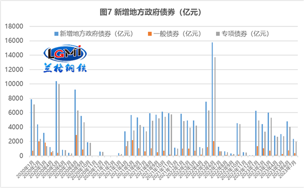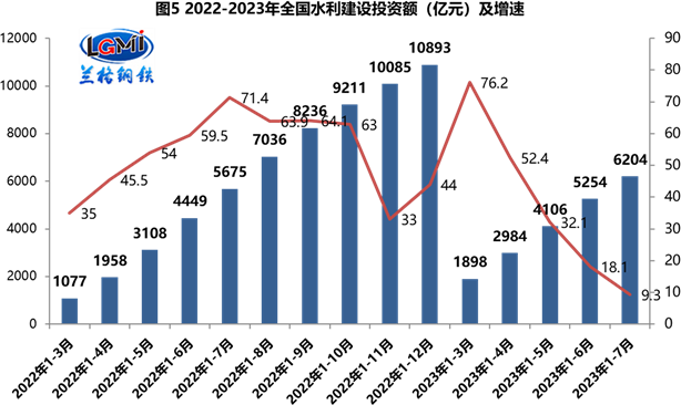 2023年以來,各級水利部門認(rèn)真落實(shí)黨中央、國務(wù)院決策部署,在堅(jiān)決抓好防汛抗洪工作的同時(shí),推動(dòng)水利建設(shè)取得了積極進(jìn)展。1-7月全國重大水利工程開工26項(xiàng),完成水利建設(shè)投資6204億元,同比增長9.3%,增速環(huán)比放緩8.8個(gè)百分點(diǎn)(詳見圖5)。目前水利部要求圍繞年度目標(biāo)任務(wù),加快推進(jìn)水利基礎(chǔ)設(shè)施建設(shè);要更大力度爭取地方政府專項(xiàng)債券,抓好水利投資落實(shí);要抓緊開展水毀水利工程修復(fù),加快工程建設(shè)進(jìn)度;要推進(jìn)第三季度擬開工重大水利工程可研審批,做好開工準(zhǔn)備,確保按期開工建設(shè)。這表明在去年水利建設(shè)投資首次邁上萬億元大關(guān)后,其后期增量空間相對有限,這將保障目前已開工水利項(xiàng)目的“鋼需”的釋放力度,但其后勁有不足的風(fēng)險(xiǎn)。