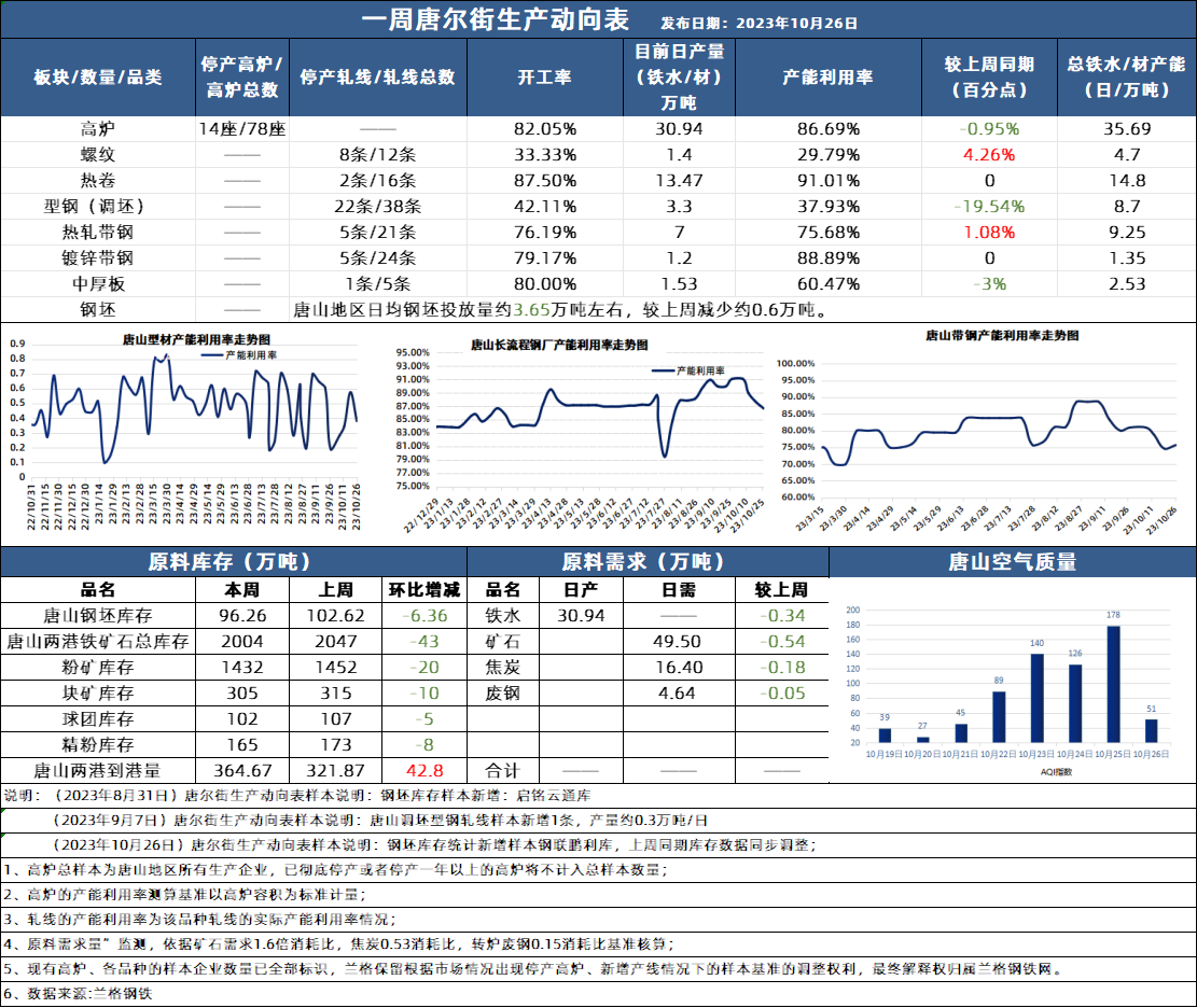 本周唐山地區樣本長流程鋼廠,高爐產能利用率為86.69%,周環比降低0.95個百分點,月環比降低4.4個百分點。調研期內新增3座高爐檢修,1座復產。