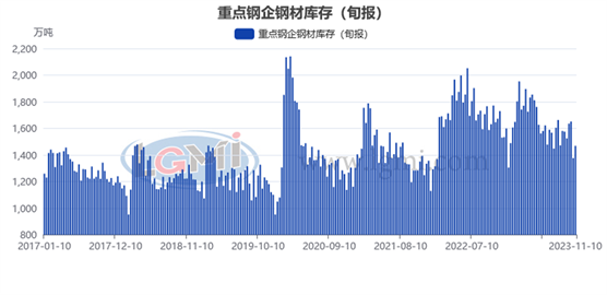 據(jù)中國鋼鐵工業(yè)協(xié)會統(tǒng)計數(shù)據(jù)顯示,2023年11月上旬重點鋼鐵企業(yè)鋼材庫存量為1468.96萬噸,旬環(huán)比增加91.83萬噸,上升6.67%;比上月同旬減少167.15萬噸,下降10.22%;比去年底增加161.52萬噸,上升12.35%;比去年同旬減少203.22萬噸,下降12.15%。