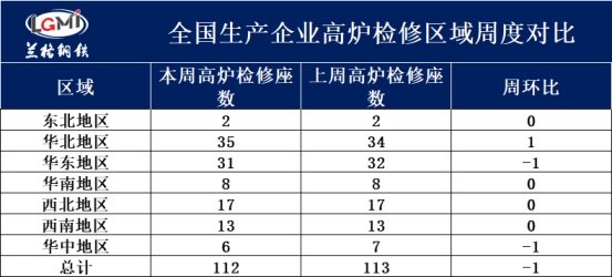 據蘭格調研:201家樣本高爐企業中,有112座高爐檢修。其中:東北地區2座高爐檢修,華北地區35座高爐檢修,華東地區31座高爐檢修,華南地區8座高爐檢修,西北地區17座高爐檢修,西南地區13座高爐檢修,華中地區6座高爐檢修。