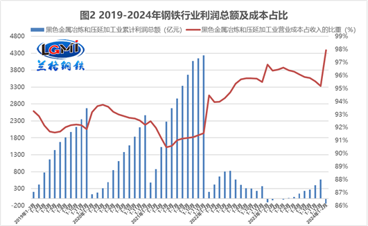 從全國粗鋼產量及噸鋼利潤的數據來看,2024年開年,國內鋼鐵生產企業再次陷入了“增產但虧損”的局面,1-2月噸鋼虧損87元(詳見圖1)。從營業成本來看,2024年開年,綜合成本呈現“大幅上升”的態勢,2024年1-2月營業成本占營業收入的比重快速上升到了近98%,較去年全年上升3個百分點(詳見圖2)。從鋼企利潤率來看,2024年開年,鋼企的盈利能力快速下降,1-2月成本利潤率為-1.23%,銷售利潤率為-1.20%(詳見圖3)。