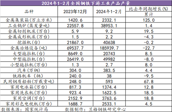 從各品種細分產量數據來看,2024年1-2月鋼材細分品類產量呈現明顯的結構分化特征,建筑鋼材類和管材類品種產量呈現同比小幅下降的態勢,而板材類品種產量呈現同比明顯上升的態勢(詳見表1)。從主要下游產品產量數據來看,裝備、汽車、船舶和家電等制造業用鋼維持了較強的用鋼增量,但與房地產和基建密切相關的工程機械等用鋼需求呈現了小幅減量的態勢(詳見表2),表明國內鋼市的供需矛盾呈現明顯的結構化特征。