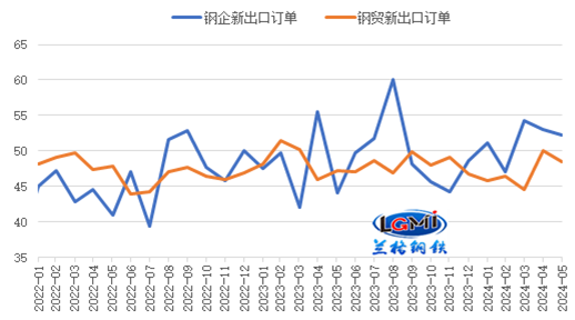 從出口訂單來看,我國鋼鐵行業出口訂單指數均有所回落,運行區間有一定分化;中物聯鋼鐵物流專業委員會調查的2024年5月份鋼鐵企業新出口訂單指數為52.2%,較上月回落0.8個百分點(詳見圖5);蘭格鋼鐵網調研的鋼鐵流通企業新出口訂單指數為48.5%,較上月回落1.6個百分點。鋼鐵企業出口訂單指數繼續在擴張區間運行,仍將對后期我國鋼材出口形成一定帶動。