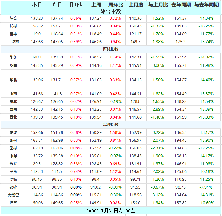 11月6日,國(guó)內(nèi)鋼材指數(shù)(Myspic)綜合指數(shù)報(bào)138.23(絕對(duì)價(jià)格指數(shù)3898.2),較上一交易日上漲0.36%。其中,螺紋鋼指數(shù)報(bào)152.66(絕對(duì)價(jià)格指數(shù)3858.8),較上一交易日上漲0.58%;熱卷指數(shù)報(bào)129.31(絕對(duì)價(jià)格指數(shù)3625.7),較上一交易日上漲0.38%。