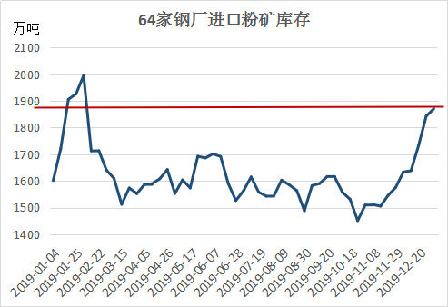 庫存方面,2020年1月3日 Mysteel監(jiān)測的64家鋼廠進(jìn)口粉礦庫存為1870.81萬噸,較上周同期增加27.72萬噸,較去年同期增加269.25萬噸。肖薇表示,今年春節(jié)在1月24日,較去年提前了10天,而去年鋼廠庫存高點在春節(jié)前2月1日達(dá)到高點,為1994.8萬噸。目前距春節(jié)不到三周時間,近期直至春節(jié)前或?qū)殇搹S補庫高峰期。
