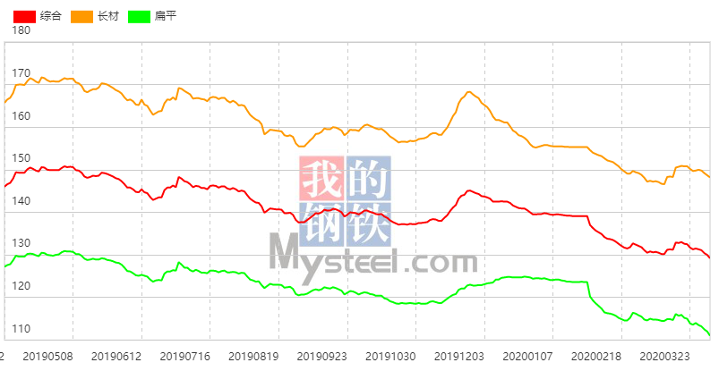 4月1日,國內鋼材指數(Myspic)綜合指數報129.18(絕對價格指數3639.5),較上一交易日下跌0.61%。其中,螺紋鋼指數報143.10(絕對價格指數3617.1),較上一交易日下跌0.47%;熱卷指數報119.78(絕對價格指數3358.5),較上一交易日下跌1.12%。